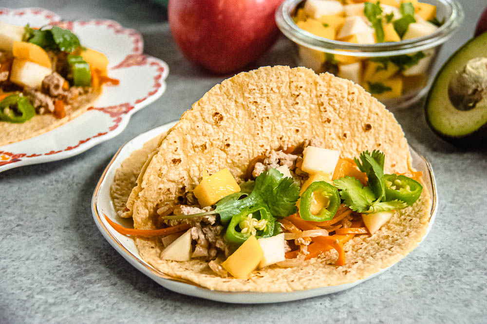 I’m using Piñata’s apples, which are very versatile and great for baking, cooking, salads, grilling, juicing, freezing, and of course – fresh snacking. It’s truly an apple with a tropical twist that really pairs well with the mango and turkey for these tacos.